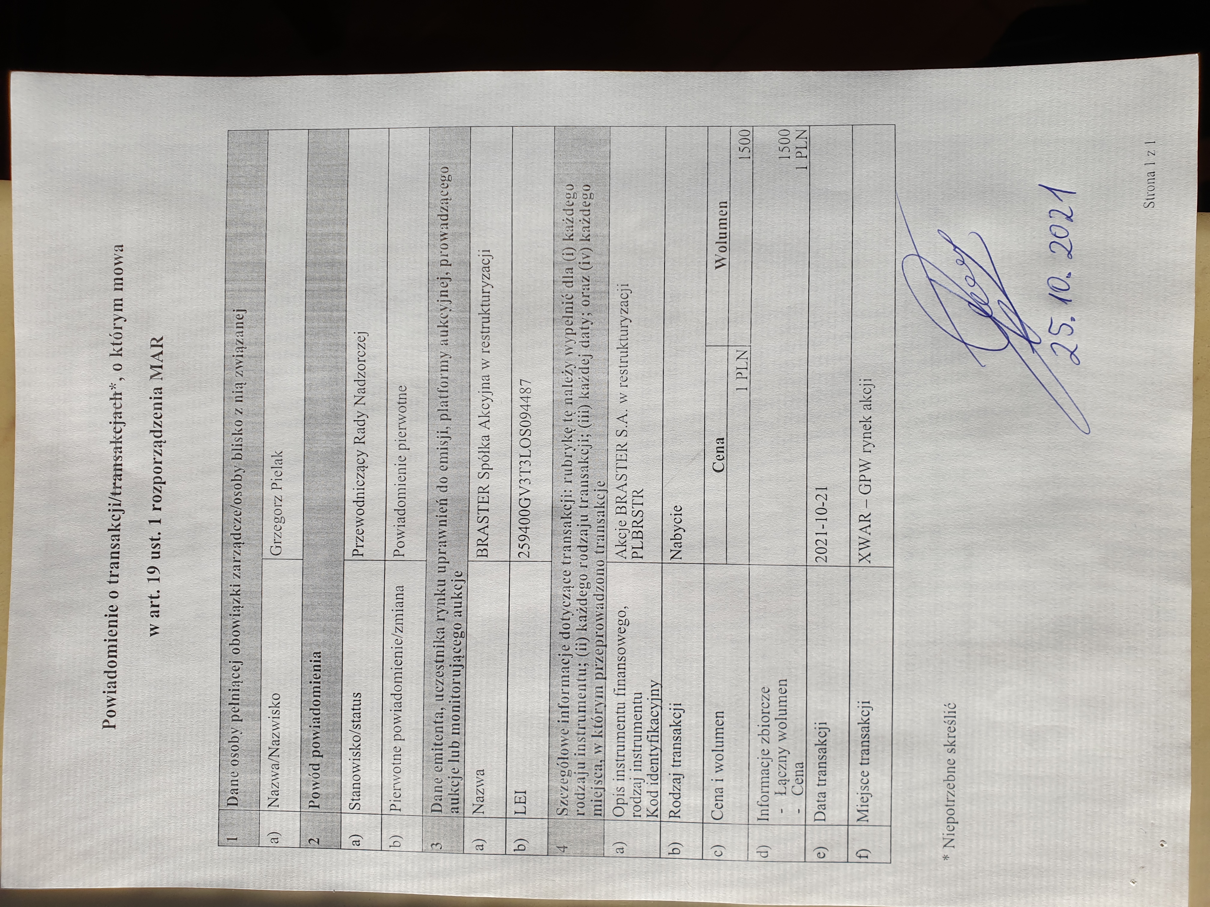 Zarząd BRASTER S.A. w restrukturyzacji _"Spółka"_ informuje, iż w dniu 25 października 2021 r. wpłynęło do Spółki od Pana Grzegorza Pielaka - Przewodniczącego Rady Nadzorczej - zawiadomienie o transakcjach nabycia akcji Spółki dokonanych na sesji w dniu 21 października 2021 roku. Treść ww. zawiadomienia Spółka przekazuje w załączeniu.
