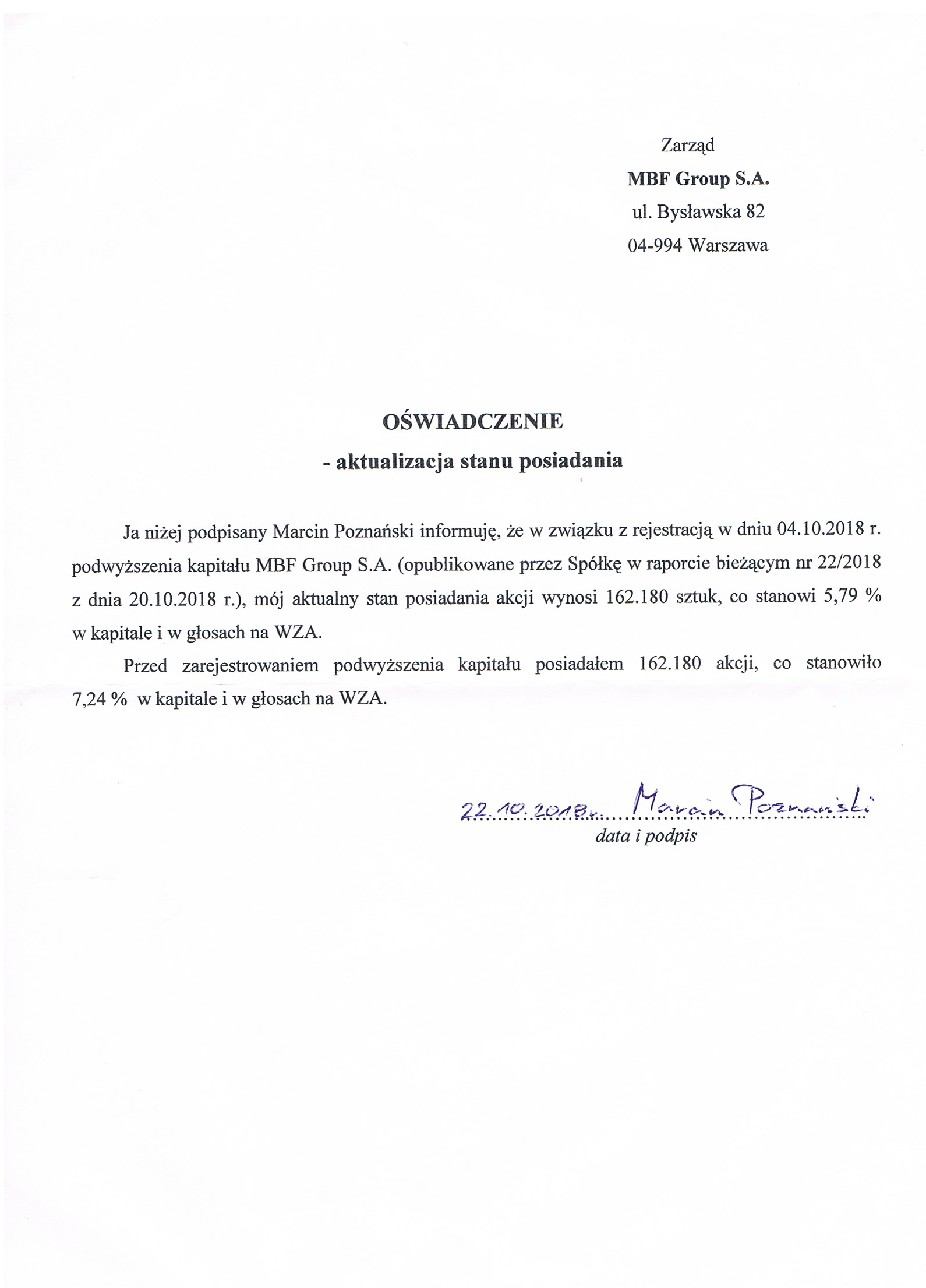 Zarząd MBF Group S.A. z siedzibą w Warszawie ("Spółka") informuje, że w dniu 2 listopada 2018 roku Spółka odebrała zawiadomienie, na podstawie art. 69 Ustawy o ofercie publicznej i warunkach wprowadzenia instrumentów finansowych do zorganizowanego systemu obrotu oraz o spółkach publicznych, od pana Marcina Poznańskiego o aktualizacji stanu posiadania akcji w związku z podwyższeniem kapitału zakładowego w Spółce i przekroczeniu progu 5% w ogólnej liczbie głosów na Zgromadzeniu Spółki.